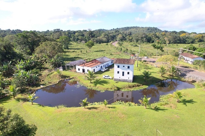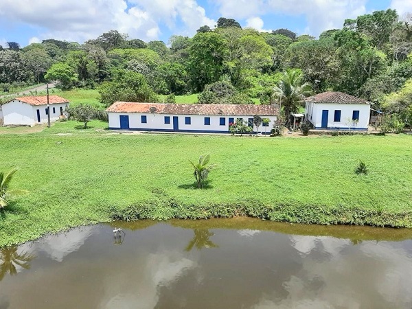 342 tarefas (148,5 hectares), casa sede de 128 m2 decorada com 04 quartos, 02 banheiros, cozinha, sala de jantar, sala de estar e garagem (Porteira fechada), 11 casas para trabalhadores, 01 casa de administrador, 01 curral com embarcador, tronco e coxos, 02 barcaças para secagem de cacau com capacidade para 80 arrobas, 08 cochos de fermentação, 01 secador burareiro (O secador “Burareiro” é um sistema de secagem artificial de baixo custo, amplamente utilizado na região cacaueira da Bahia para secar cacau em períodos chuvosos, projetado para pequenos e médios produtores, possui fornalhas de alvenaria ou ferro, geralmente nas dimensões de 2×2 m ou 3×3 m, sendo uma tecnologia simples e eficiente) com capacidade para secagem de 30 arrobas em 24 horas, 01 armazém de cacau, 128,5 hectares plantados com 80 mil pés de cacau sendo 50% safreiro, 20% clonados, 10% mudas comum e 10% de mudas clonadas, viveiro para 7.000 mudas de cacau com possibilidade de venda para o público externo, além do plantio de cacau, foi investido também em gado, pau-brasil e na produção de açaí como alternativa agrícola em expansão, represa com água e minador.